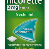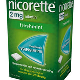 Tyggegummi med nikotin. Frisk smak av mint. NICORETTE® tyggegummi demper nikotinsug og gir dermed viljestyrken litt hjelp når du skal slutte å røyke. Forsiktighetstekst: NICORETTE® (nikotin). Reseptfritt legemiddel til bruk ved røykeavvenning. Ved graviditet. amming eller alvorlig hjerte- og karsykdom bør Nicorette® kun brukes i samråd med helsepersonell. Les pakningsvedlegget før bruk. McNeil Sweden AB.